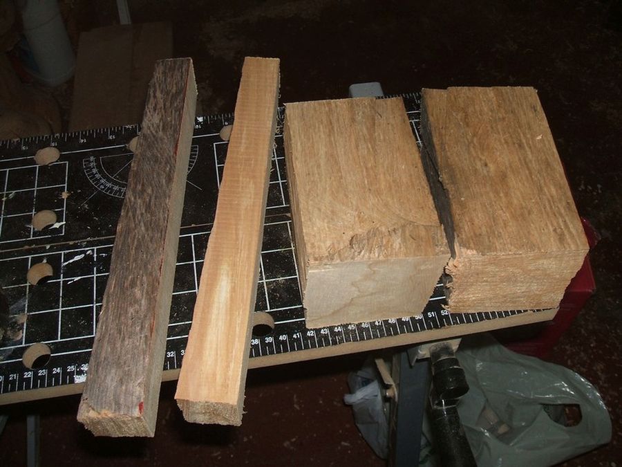 | To start with you need a square about 6" long by 3 1/4" square and one about 10 1/2" long by 1 /14" square. Mark the ends for center. Here I am using some spalted elm. We are following the diagram in Milton and Wohlers. |