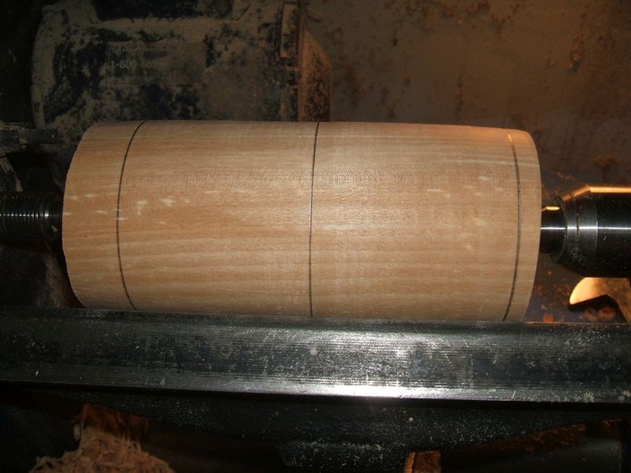 | Mount the large square between centers and turn it round. Measure with parting tool and calipers to 2 1/2" and turn the cylinder to the measure. |