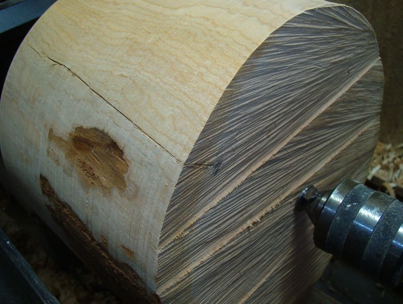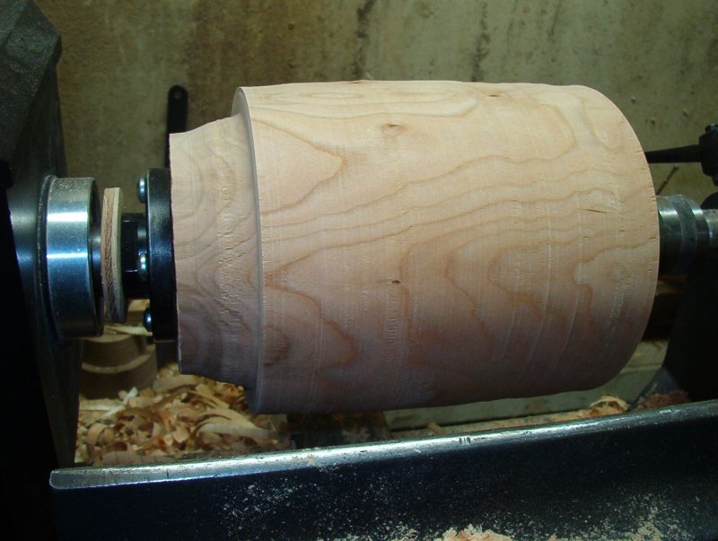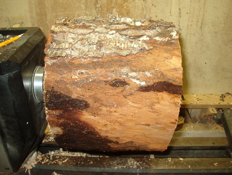 I had a piece of black cherry that I was able to cut down to a log about 10" in diameter and 11" long. Intending to make a thin walled vase I attached a 3" faceplate with 1 1/2" long #14 self tapping sheet metal screws.