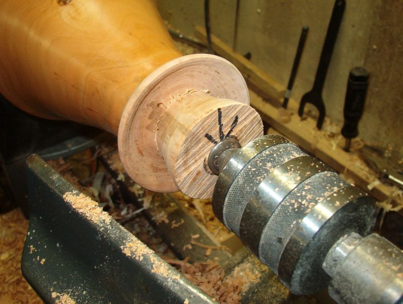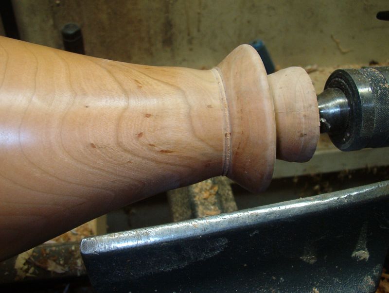 The 3⁄16" Oland is sharpened and the foot is undercut to remove the screw holes and to lighten the base. The tenon is turned to less than a quarter inch.
