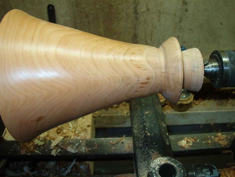 While there is still lots of wood supporting the piece I begin to sand the base exterior. The tool marks at the foot will need a bit more work.