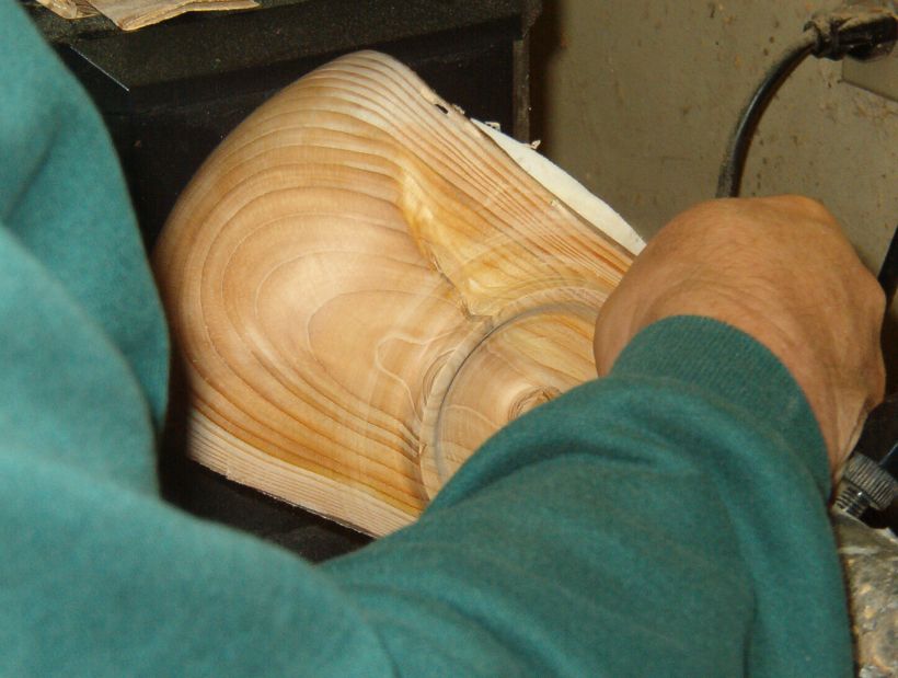 Turn the tenon as small as reasonable. Tamarac is a fairly soft hardwood and there has already been a chip off the tenon, so I will leave it at about 3/16". Some harder woods can be taken to 1/8", depending on you nerves. I have had a piece or two bounce off the lathe. That generates a lot of sanding or a bit of kindling.