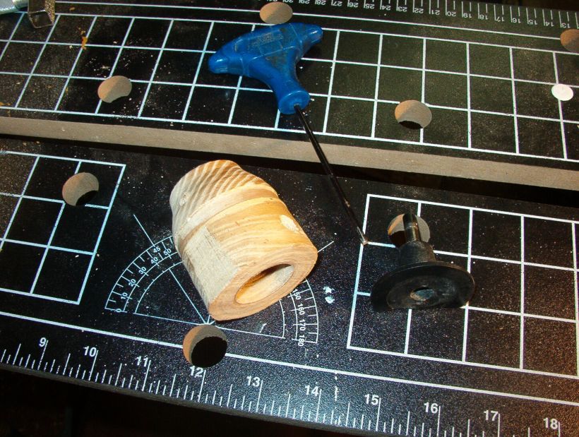 The three parts of my system include a lathe block threaded 3/4" x 16 thread for my bowl lathe, a Roll-Lock™ disk holder, and a 3mm hex key for the two hex screws that hold the disk holder in the lathe block.