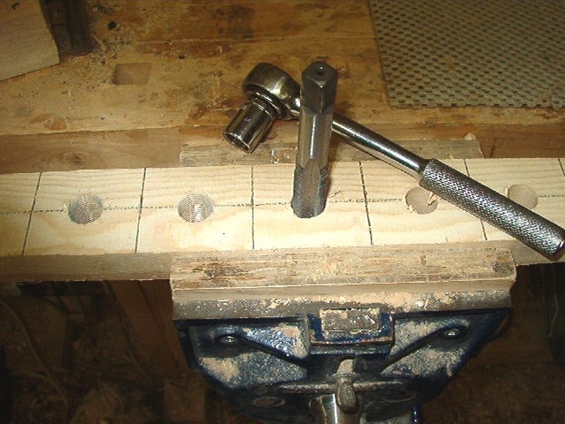 Once the holes are drilled I hold the board in my bench vise to tap the holes. You can see the holes on the left are tapped, the ones on the right wait, and I am busy at center. Tapping the hole is a lot like driving a lag bolt with a wrench. The tap scrapes its way through the hole, making threads as it goes. Take your time. You get a cleaner cut and the tap has to work hard. Once in a while, back the tap up a bit to clear the shavings and then proceed with the tapping.