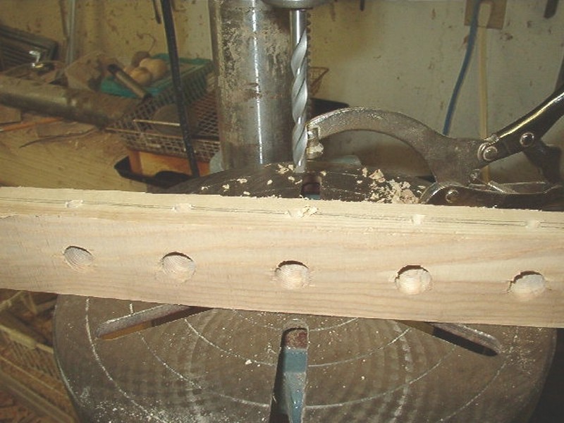I mark it into squares and mark the center of each square. Exact measurements are not critical, the glue block will arrange itself as we go. I use a spade bit to drill the appropriately sized hole for the tap, here 11/16".