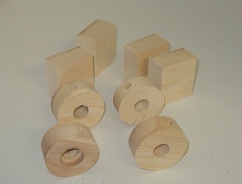 Reverse the piece on the lathe and flatten the other side. Here are four pieces threaded and flattened on both sides. The fifth had a split I found while turning it so it became scrap wood again. Along with nuts are four pieces of scrap each about 2 1/4" square and flat on one side. Flatten them with a plane or sander or whatever. I recommend using hard wood of some kind, usually whatever is in the scrap box is fine.