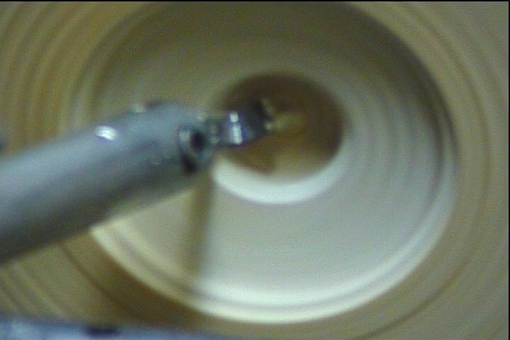 A hook tool cuts from the center out. In order to cut at the center, there are three basic approaches. The first is to use the tool itself for the center cuts. This is especially useful in shallow bowls. For this to work you need to approach the bowl just right of center where the rotation is actually upward. For a good cut the hook enters in at 45 degrees to the face of the bowl and cuts through the center, then proceeds as far as is comfortable. |