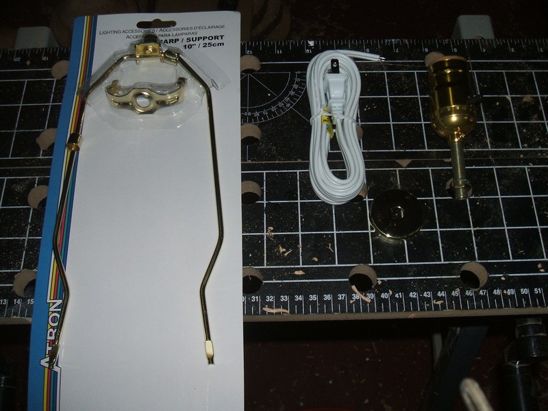 Parts for a lamp are quite simple. Here is a 10" harp to hold the shade, #18 lam cord and plug, a decorative washer and a bulb socket with switch attached to a length of 3/8" threaded brass tubing.