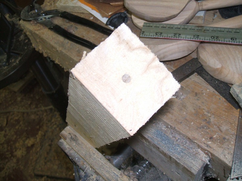 The square is moved to the bench vise and the hole serves as a guide for a 1/4" brad point bit in a hand drill.