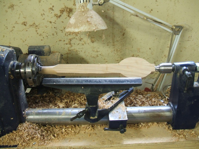 Mount the blank between centers. The tailstock center is offset from center about 1/4" so as to give an angle to the handle when the spoon is reasting. this makes it easier to pick up.