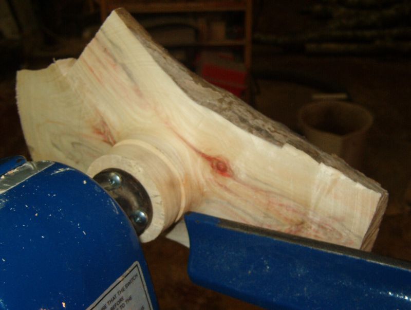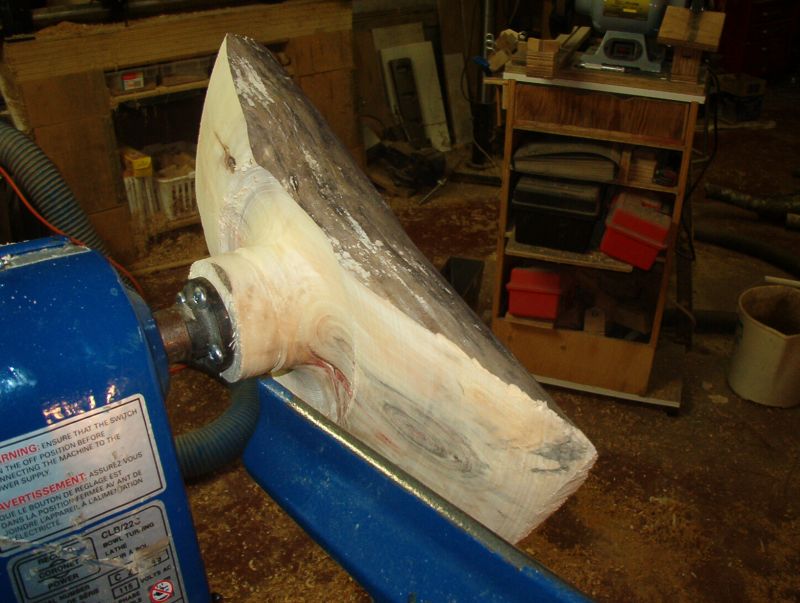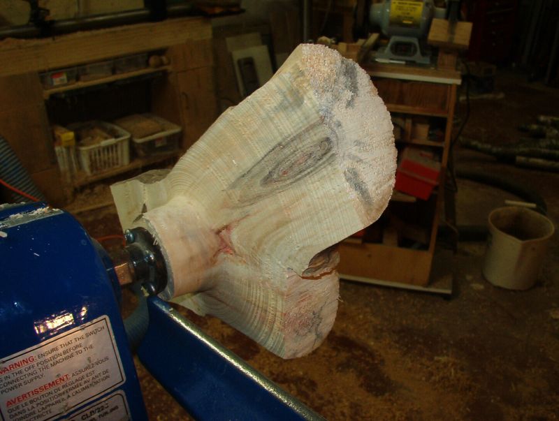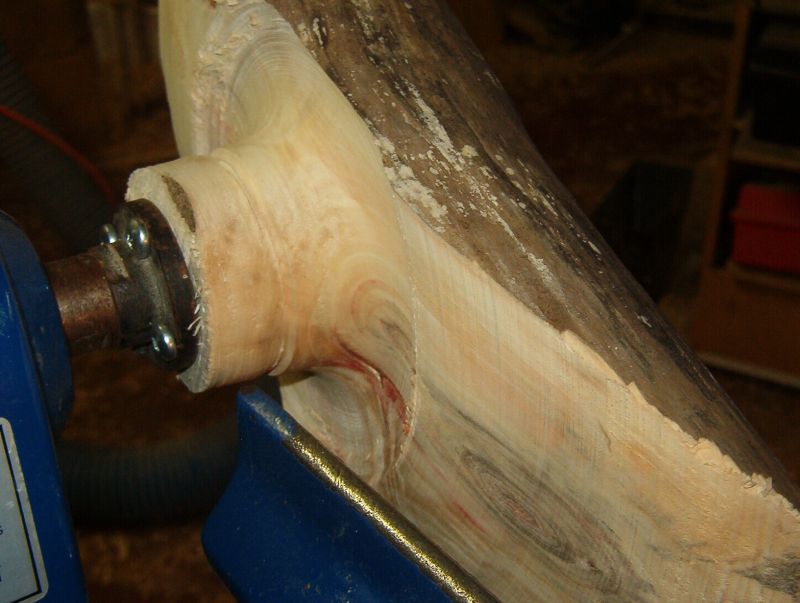 At the other I am both on center and distant. Crotch wood will often do that to you. If I had been able to start between centers I could have lined up the work there.