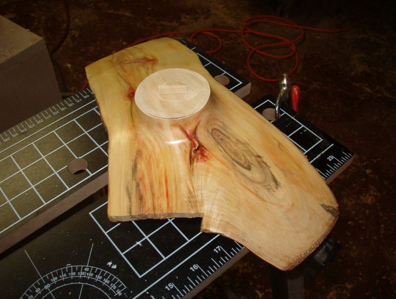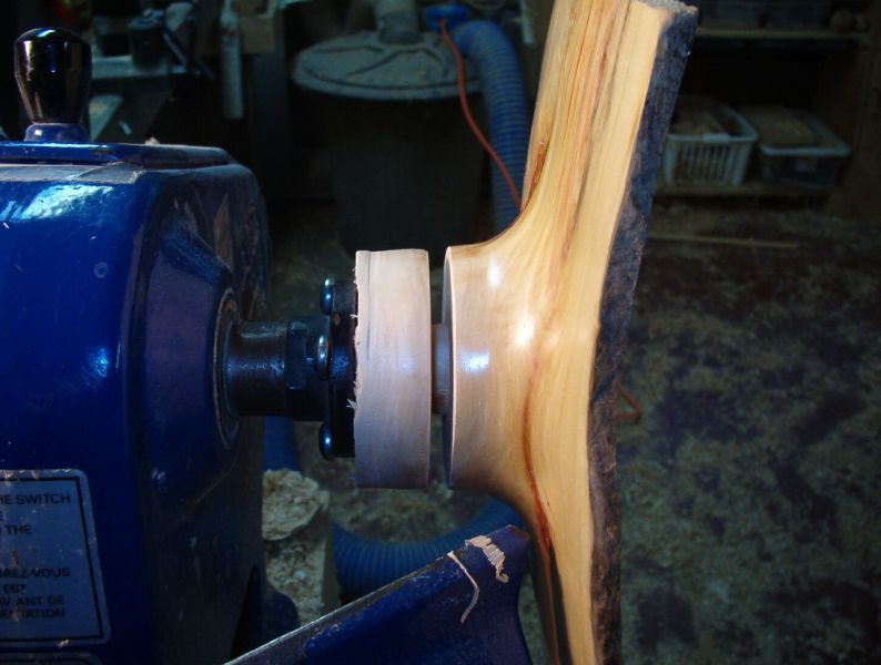 Using a 3/16" parting tool I cut in on the base leaving a conecting tenon between 3/4" and 1" thick.