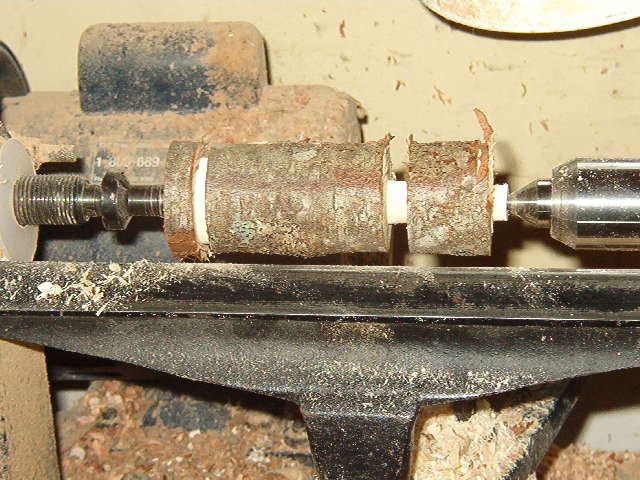 I used to turn a tenon on the mushrooms, chuck them up and turn them, finishing off the cap on the lathe. Lately I find it just as easy and a touch faster to turn them between centers, pare off the top with a knife and cut the bottom on the bandsaw, and sand to finish. Here is one between centers, ready to go. I am not fussy about the piece being exactly centered since the sapling is not perfectly round and a bit off center lends character to the mushroom.