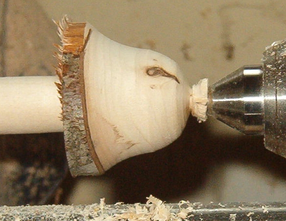 Having finished stipe and top with the Oland or skew, reduce the stem at the top with a 1/4" spindle gouge or skewchigouge or skew and remove the mushroom.