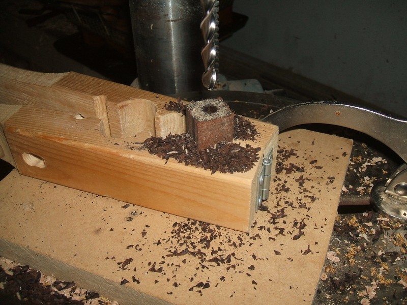 It is necessary that the tubes mount squarely to each of the bushings and later to each of the pen parts that will be press fit into place. To do this I use a pen squaring device that looks and acts like a counterbore with a long center. Putting the squaring device in the drill press and the blank in the drilling jig I square the blank