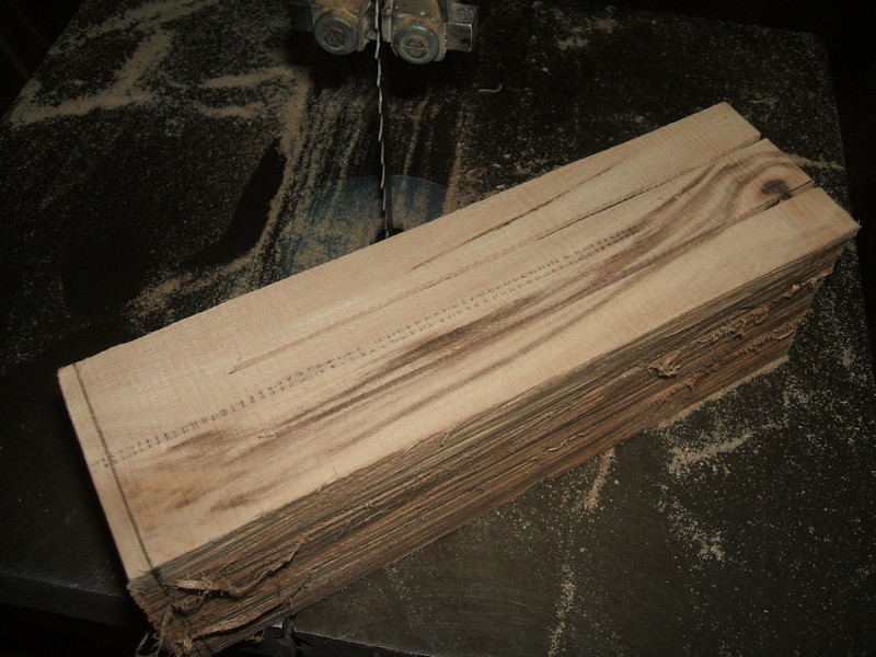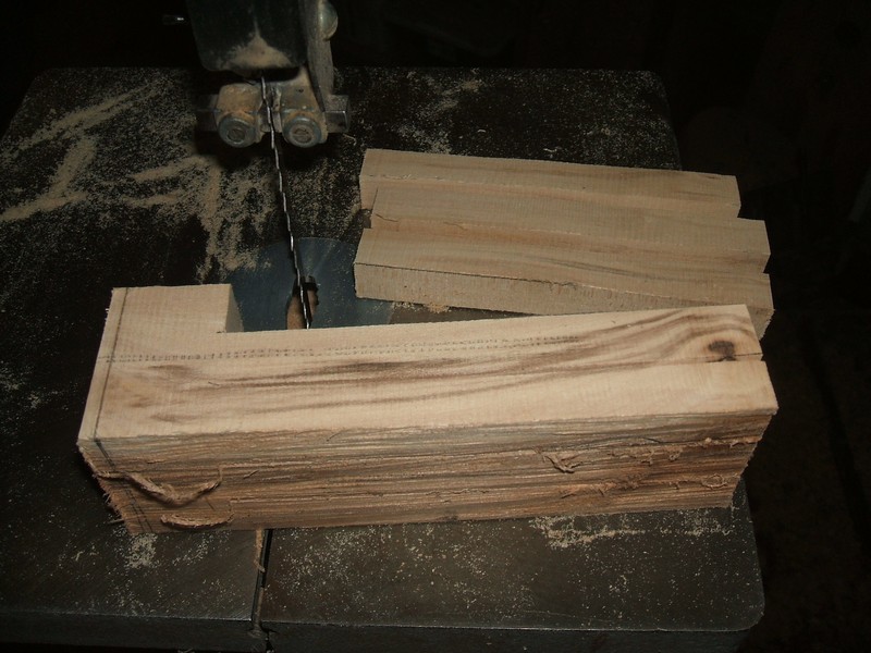 The center is marked out and a 5/8" section marked in the center about 5" long. Two opposite sides should be marked. Some simple woodworking skills and a good bandsaw will allow the waste wood to be taken quickly away.