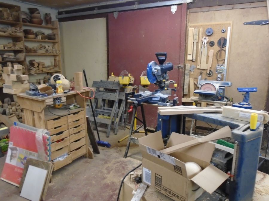 There is a table saw under there and shelves with drying or dried projects and scrap or other wood behind. The shop vac needs new home, that chair is in bad shape and the plastic box is full of finished stuff and needs to be stored. The cabinet has been used to hold boxes for projects on top and packing stuff inside.