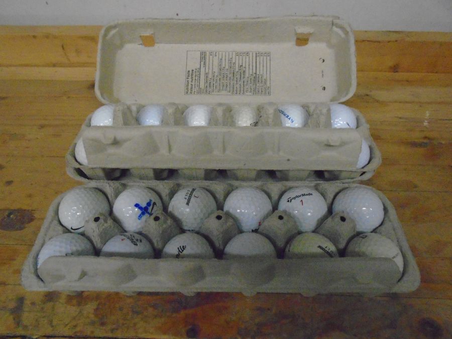 | Inside the egg cartons are used golf balls, one of those chores for dads to do. My daughter carves golf balls. In order to do so needs to have the covers removed. Guess who gets the pleasure? For now the golf balls go to the project section. |