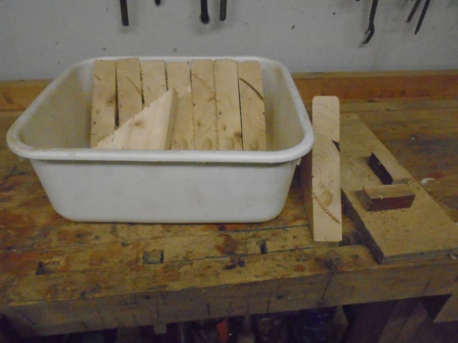 | A lot of things happen in the shop that have nothing to do with turning or carving. These brackets will eventually be finished and used to hang eaves trough. The jig is used at the drill press to ensure that each is drilled uniformly. |