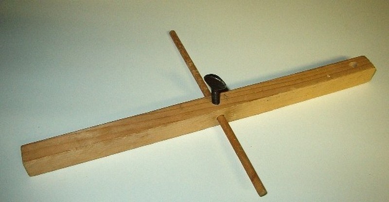 I like to use a pencil in a marking gauge but this is as easily made by driving a nail through the end of the dowel and sharpening the tip with a file. Cut a piece of wood to desired shape and drill a hole for a 1/2" dowel. Drill a 7/32" hole at right angles into the first hole through the edge of the wood piece. Tap the 7/32" hole 1/4" x 20 for a standard 1/4"bolt. Drill a hole in the end of the dowel large enough for a pencil to fit comfortably and a 7/32" hole at right angles. Tap the 7/32" hole 1/4" x 20 for a set screw or short bolt. Insert the bolts, dowels and pencil.