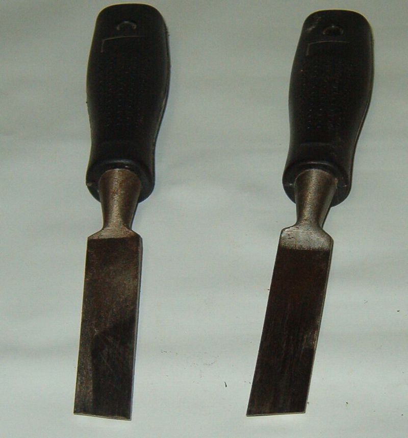 Here are a couple of those chisels ground as scrapers. I just knock off the bevel with a grinder and put a new one in place. The left scraper is for bowl interiors and the right one for inside boxes or bowls for the transition from side to bottom.