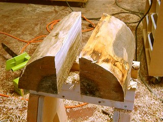 While it has nothing really to do with bowls, this has a lot to do with going from log to lathe. I tend to do a lot of spindle turning, especially for craft shows, so I have decided to cut the other half the log into 3/4" thick boards for spatulas. To start with, I cut the half log down the center with the chain saw. By the way, the saw bar is on correctly. Chain saw bars are symmetrical and I like to flip it every now and then for even wear. I am not sure if it is worth it but I have been doing it for almost fifty years and would have trouble changing now.