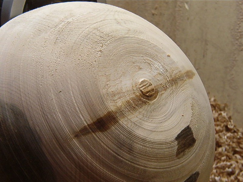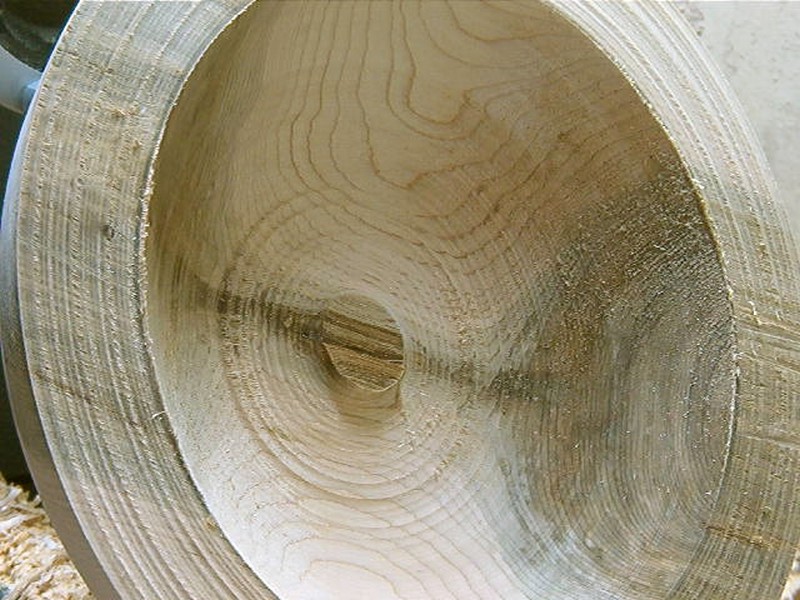 Similarly, cradle the bowl in one arm while removing the inner tenon by striking it with a mallet or, my preference, the handle of the last tool I used in turning which is likely the same one I used to remove the bottom tenon. Give it a good rap. If the tenon does not pop off the first time rotate about 90° and try again. If at first you don't succeed and all that.