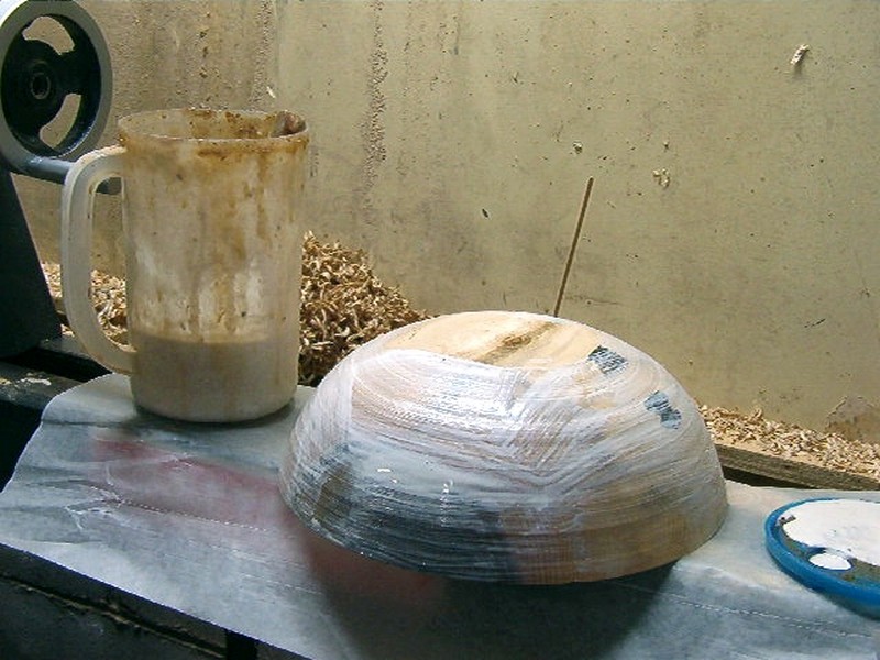 Treat the end grain of the bowl with Anchorseal or its equivalent. This is a wax emulsion designed to slow the drying of the bowl blank and reduce cracking and splitting. Some people bury the bow in damp shavings or put it in a couple of paper bags instead. I do not have paper bags that big and find that damp shavings promote mildew and mold. Your mileage may differ. Use something. I prefer Anchorseal I also find it more than sufficient to just treat the endgrain on the outside of the bowl. Again, it is your bowl. Go ahead and paint the whole inside and outside if you like. I find just painting the outside endgrain to work really well.
