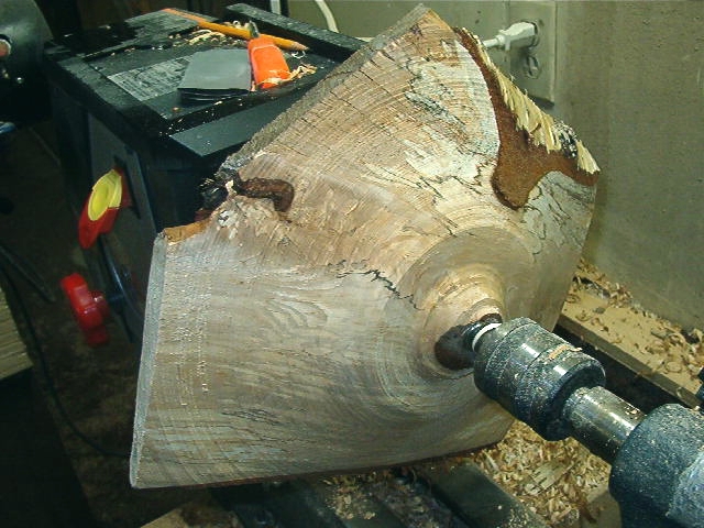 | Using the bottom to determine the shape, I turned the piece over and hollowed out, leaving about 3/4" in thickness. I also left the core so I can remount later to trim it to size. |