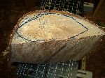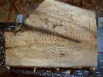 Some time ago I had made up an acetate of circles by using a computer drawing program to draw a range of circles from about 1" to 8" and then printing it out on an overhead sheet. Here I lay it on the wood to check for grain flow, color, and clearance from cracks.