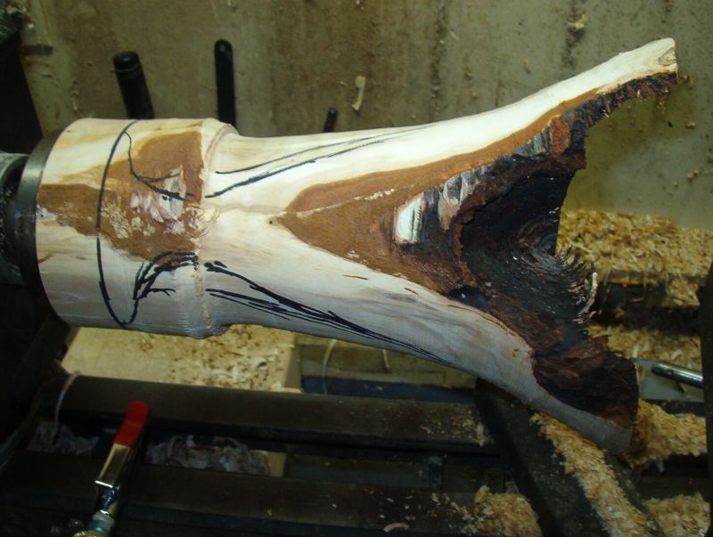 So far, at least on this side, I am following the line of the bark down the side and it looks alright, but I am beginning to wonder if the stem of this piece should not be a lot narrower? A few lines drawn in confirm the suspicion.