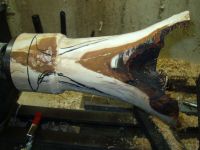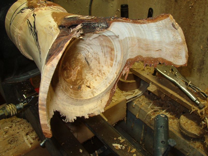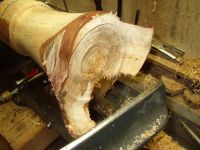The wings are beginning to form and I change the tool rest, not really necessary but I have decided to use a 3/16" scraper to make a hole at center as it is easier to use the hook tool in this fashion and I am used to using a regular tool rest with the scraper.