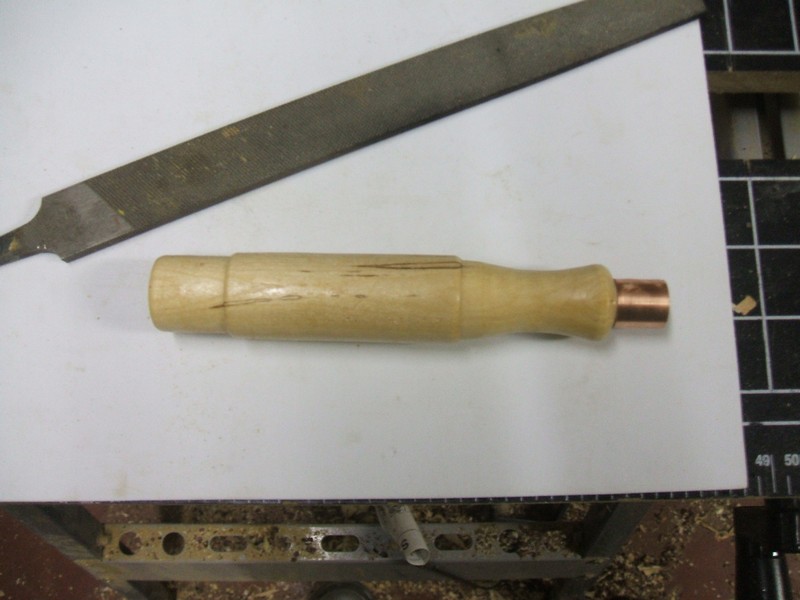 With the ferrule in place, sand the piece to about 220 grit. Finer is not necessary for a tool handle. Sand the ferrule to remove any oxides. Part in front and back preparatory to cutting the bits of tenon off while off the lathe. Finish the handle if you so desire. I used a bit of turner's polish.
