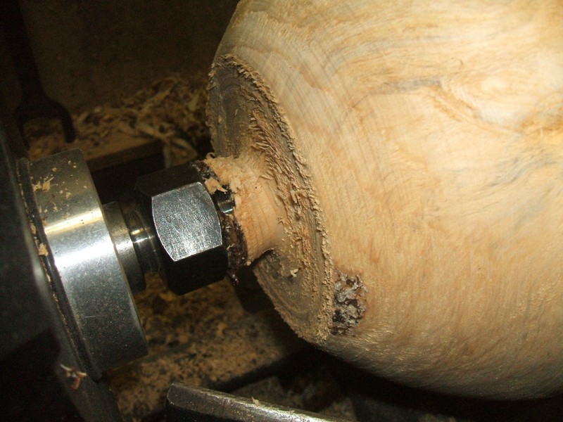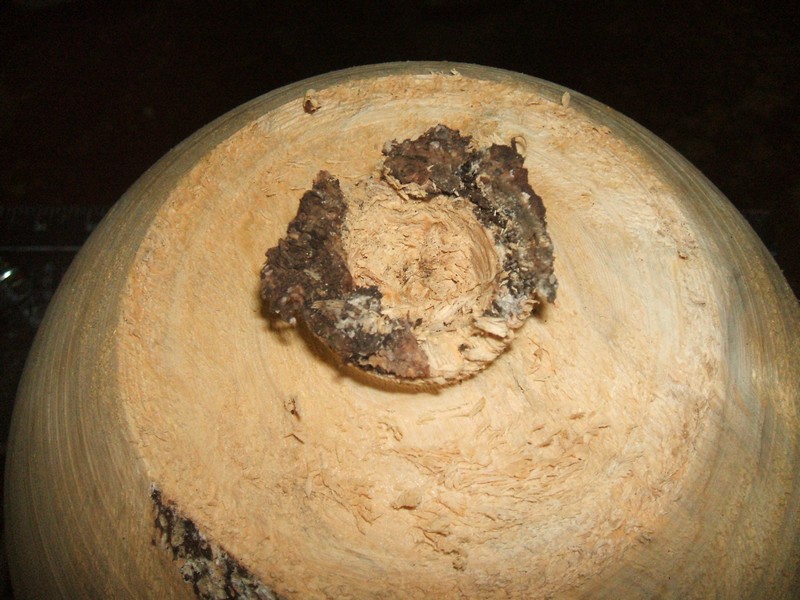 Here you can see that the spur did a fair job of boring its way into the wood, but was still able to grip with its spurs and keep the burl moving. Wood turning is sometimes compromise. The bark is fairly torn away and the softness of the wood is evident.