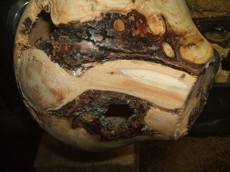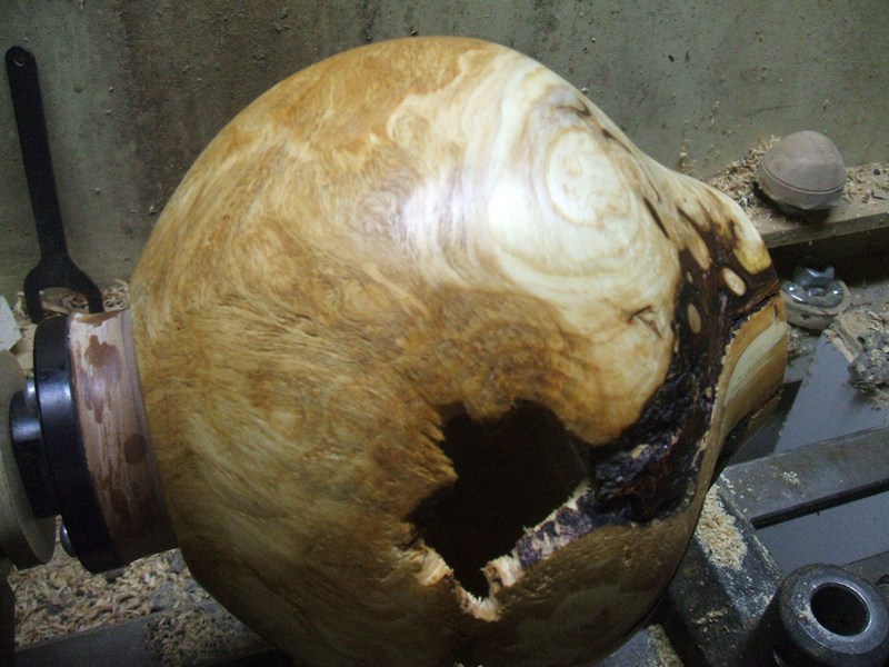It also gives a greater contrast with the varied grain of the burl. Depending on how the light is hitting the piece, there will be an even greater contrast with the inside of the vessel as seen through the hole in the body.