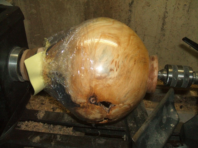 Remembering the weakness of the neck due to that included branch, I now need to strengthen it temporarily. Ideally, I could wrap it with strong tape such as Duck tape or fiberglass reinforced tape, but that would leave a residue of adhesive which is awkward to remove and might even pull some wood away as it was removed from the burl. Instead I gave it several wraps of the clear cellophane tape that is used to tie pallet material. This is non-adhesive and sticks only to itself. It is also easy to find at most hardware stores these days.